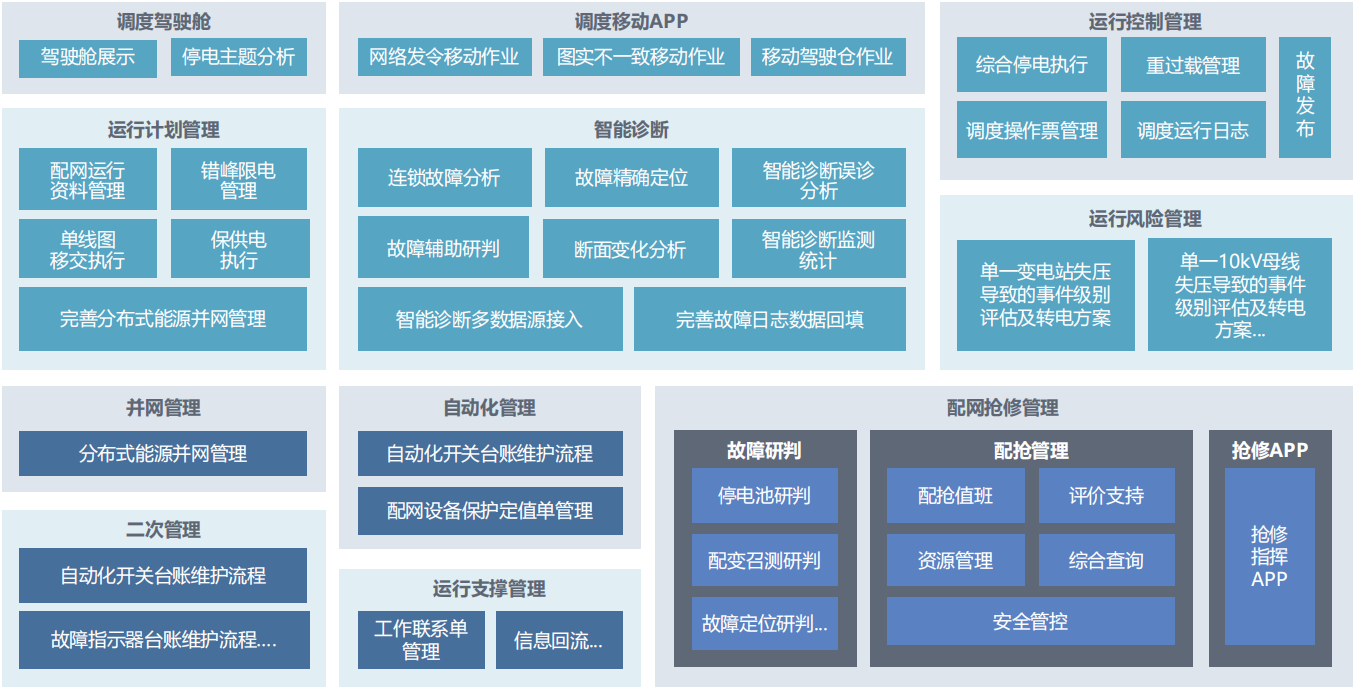 數(shù)字配電網(wǎng)管理解決方案, 是集調(diào)度生產(chǎn) 、專業(yè)管理和調(diào)度業(yè)務(wù)處理為一體化的調(diào)度運行管理支撐平臺 , 實現(xiàn)配網(wǎng)調(diào)度業(yè)務(wù)全范圍 、全過程 、智能化管理 , 業(yè)務(wù)功能上覆蓋運行計劃管理 、運行控制管理 、故障智能診斷、運行風(fēng)險管理、并網(wǎng)管理、二次管理、自動化管理、 運行支持管理、調(diào)度移動APP 、配網(wǎng)搶修管理、調(diào)度駕駛艙等11項功能大類。 平臺以信息化建設(shè)為支撐 , 促進各專業(yè)的管理標準化、 操作規(guī)范化 、流程一體化建設(shè) , 實現(xiàn)了三個職能 (配網(wǎng) 調(diào)度、系統(tǒng)分析 、快速復(fù)電故障指揮) 、兩個服務(wù) (為客戶服務(wù)、為縣,/區(qū)局和供電所服務(wù)) 的工作目標。應(yīng)用場景