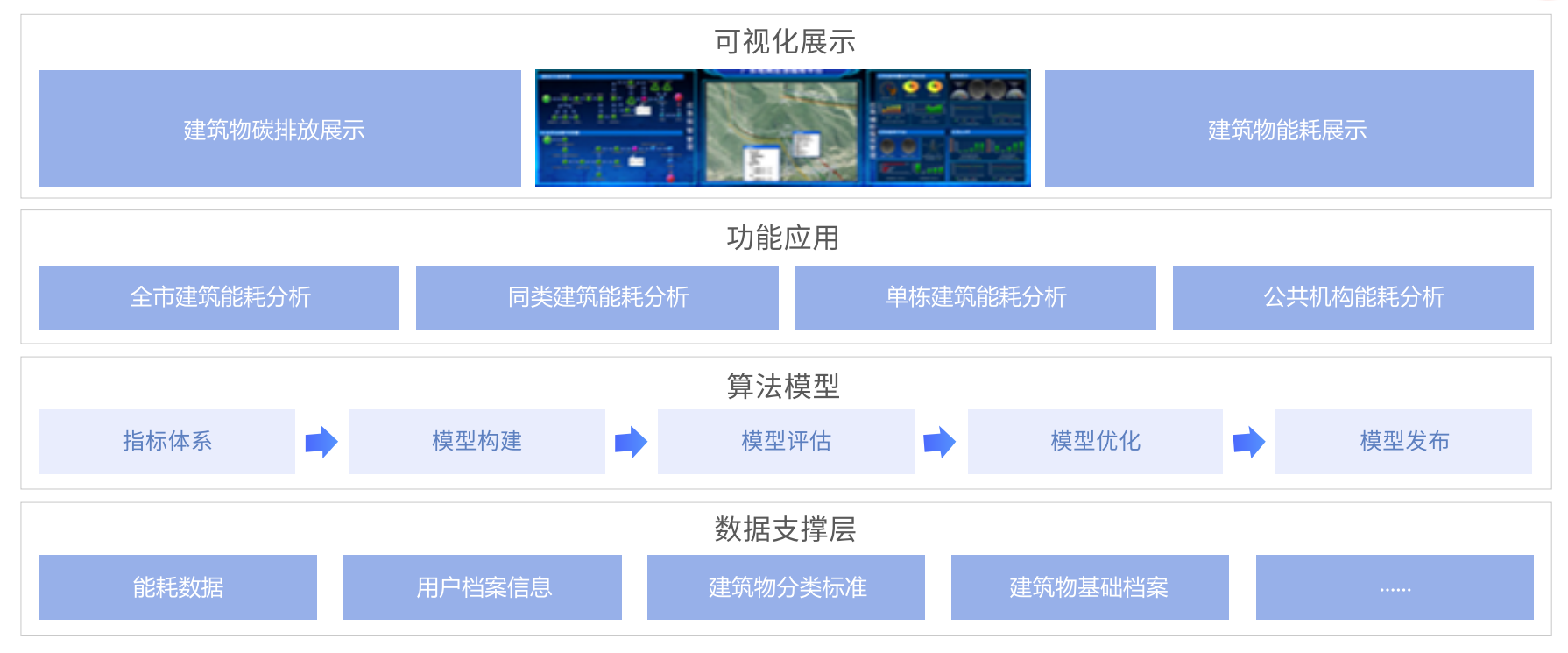 基于大數(shù)據(jù)分析與可視化技術(shù)的應(yīng)用,實(shí)現(xiàn)對(duì)城市能耗情況進(jìn)行分析與可視化監(jiān)控,幫助各級(jí)管理單位從建筑物的視角,掌握城市整體的能耗水平與不同維度的能耗結(jié)構(gòu)。