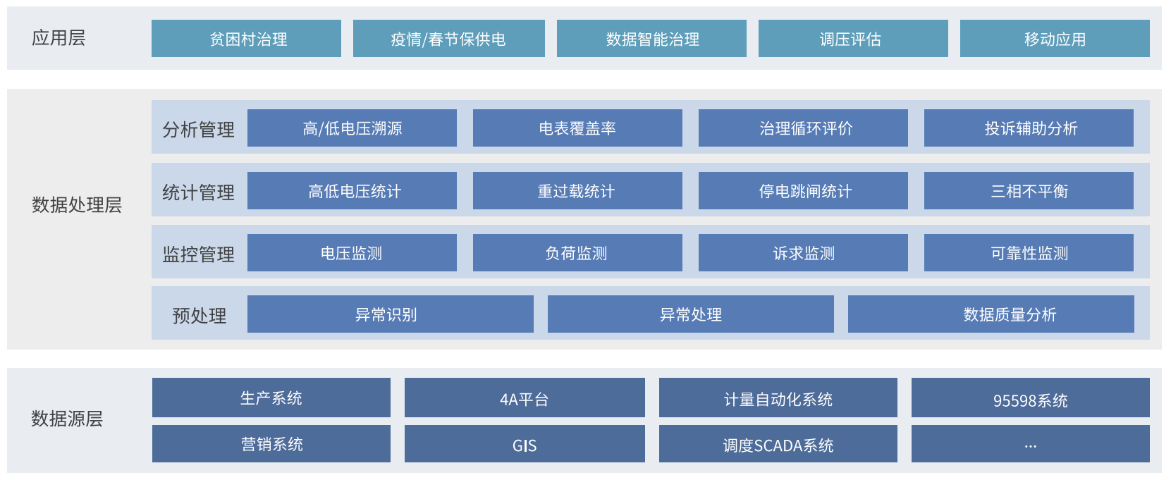 生產(chǎn)監(jiān)測解決方案是開展電壓質(zhì)量管理的監(jiān)控指揮系統(tǒng),系統(tǒng)融合營銷、客服、生產(chǎn)、GIS、計(jì)量、調(diào)度等系統(tǒng)數(shù)據(jù),完成千萬級測點(diǎn)數(shù)據(jù)的快速的清洗、計(jì)算、分析和應(yīng)用,建立電能質(zhì)量“采集-監(jiān)測-分析-治理-評價(jià)”的閉環(huán)管控機(jī)制,構(gòu)建“站-線-變-戶”一體化數(shù)據(jù)模型,擴(kuò)大居民用戶電壓監(jiān)測范圍,挖掘智能電表數(shù)據(jù)應(yīng)用場景,綜合利用智能電表、電壓監(jiān)測儀、負(fù)控終端等多源數(shù)據(jù),分析可能存在或潛在高低電壓、重過載問題的變電站、母線、中壓線路和配電臺(tái)區(qū),梳理問題清單,對問題進(jìn)行溯源,輔助精準(zhǔn)運(yùn)維。