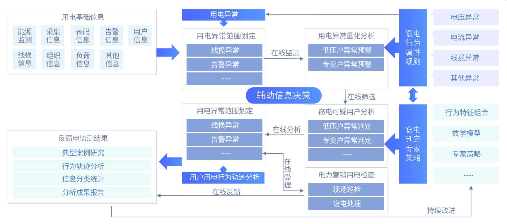 運(yùn)用大數(shù)據(jù)技術(shù)融合營銷、計(jì)量(用采)、 配網(wǎng)以及客戶服務(wù)等主題的海量數(shù)據(jù),通過實(shí)時(shí)/準(zhǔn)實(shí)時(shí)計(jì)算分析數(shù)據(jù)之間的內(nèi)在關(guān)聯(lián)性、邏輯關(guān)系和數(shù)據(jù)表征,建立一套科學(xué)、精確的數(shù)學(xué)模型和分析方法,實(shí)現(xiàn)智能化的異常監(jiān)測 、跟蹤定位和分析診斷,最終為有效反竊電提供系統(tǒng)化、智能化、自動(dòng)化手段。