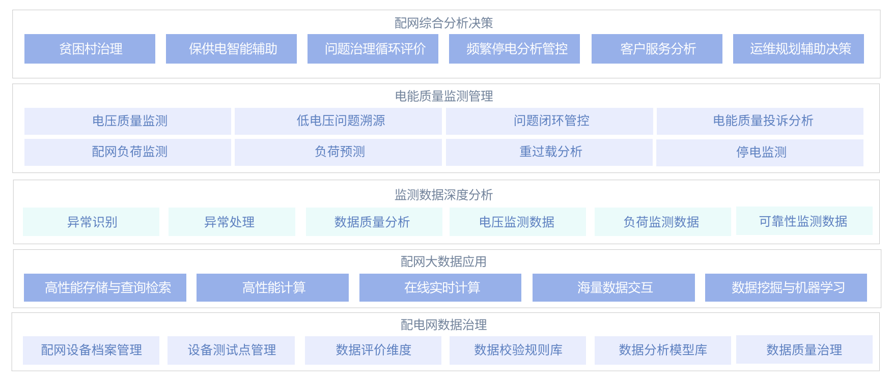 系統(tǒng)主要聚焦于配電網(wǎng)電能質(zhì)量管理,以大數(shù)據(jù)、人工智能、物聯(lián)網(wǎng)、云等技術(shù)為驅(qū)動(dòng),充分利用配電網(wǎng)數(shù)據(jù)信息,基于智能電網(wǎng)和物聯(lián)網(wǎng)建設(shè)成果,通過電網(wǎng)信息融合、大數(shù)據(jù)挖掘分析、人工智能及交互 式可視化技術(shù),實(shí)現(xiàn)在線開展配網(wǎng)電能質(zhì)量監(jiān)測和治理,對電能質(zhì)量問題進(jìn)行監(jiān)控、分析、溯源、治理、 評價(jià)和決策應(yīng)用,同時(shí)結(jié)合網(wǎng)架可靠性評價(jià)體系,為配電網(wǎng)規(guī)劃改造、運(yùn)維及應(yīng)急保供電提供輔助決策 支撐,從而提升供電可靠性和客戶滿意度。