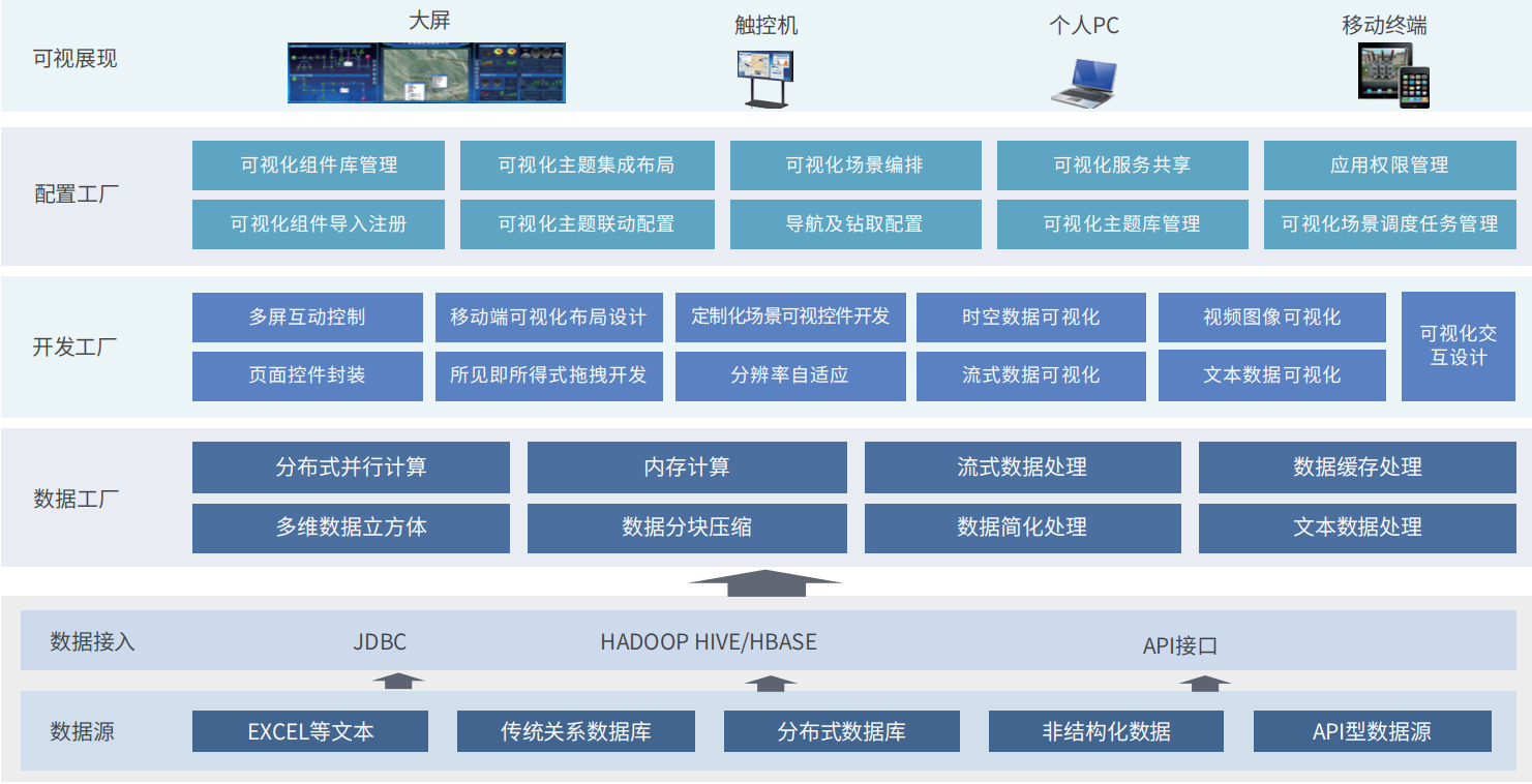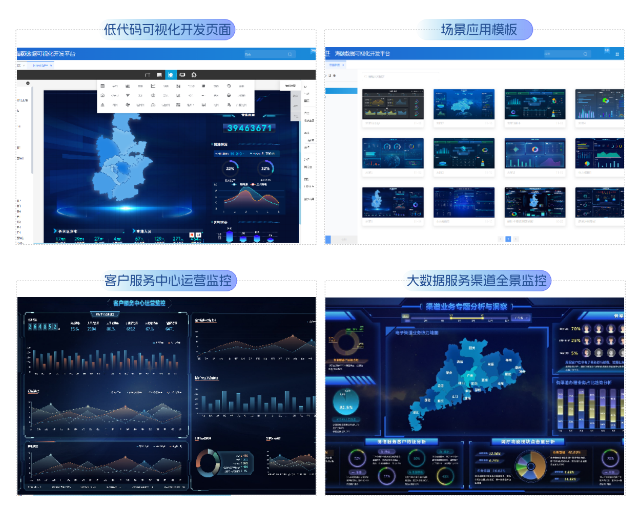 針對各行業(yè)的各種展現(xiàn)場景進行快速可視化的套裝軟件,以簡潔式操作和配置為主,可針對突發(fā)業(yè)務 展現(xiàn)需求進行及時構(gòu)建和響應。平臺的使用無需專業(yè)技術(shù)人員介入,可完全面向業(yè)務人員,通過簡單的 自助拖拽實現(xiàn)展現(xiàn)效果的呈現(xiàn),便于以業(yè)務需求為主導的方式進行業(yè)務數(shù)據(jù)的自主探索。該平臺提供豐富的可視化展現(xiàn)方式,支持多尺寸終端的自動適配,以最大程度降低使用人員的技術(shù)門檻,解放業(yè)務人 員專心解決業(yè)務問題、探索業(yè)務規(guī)律。