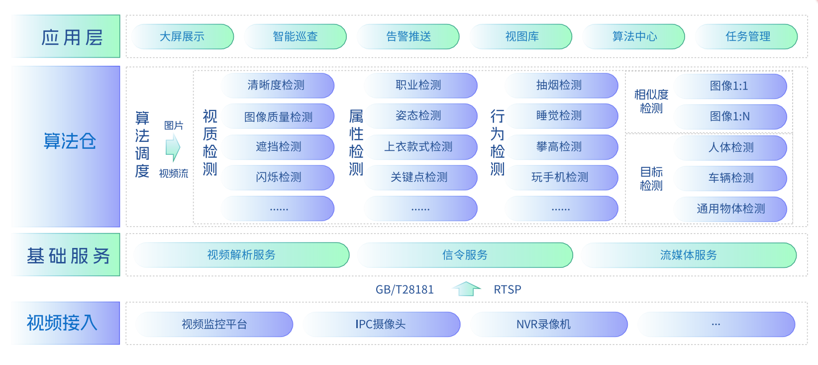圖像智能分析平臺是專門提供人工智能圖像分析服務的預警監(jiān)測平臺。平臺基于計算機視覺技術,依靠 自主研發(fā)的深度學習算法,提供海量圖像內(nèi)容的精準識別和高效處理服務,實現(xiàn)非人為干預下的人、車、 物、行為、事件等的智能監(jiān)測、實時預警、全程溯源。算法覆蓋人體檢測、屬性檢測、通用物體檢測、車 輛檢測、行為檢測、姿態(tài)識別、圖像相似度檢測、圖像質(zhì)量檢測等諸多場景,可廣泛應用于電力、公安等 多個行業(yè),助力政企單位提高視頻監(jiān)控的智能化水平。