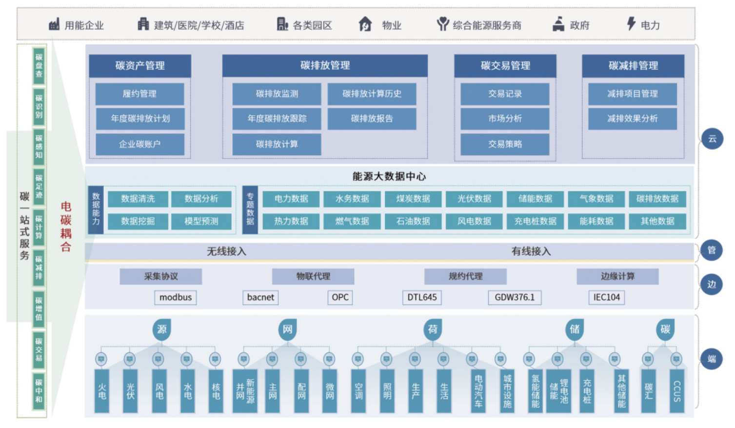 園區(qū)低碳智慧能源管理系統(tǒng)通過自動采集現(xiàn)場設(shè)備、儀表實時數(shù)據(jù)以及人工錄入的基礎(chǔ)資源數(shù)據(jù),利用計算機網(wǎng)絡(luò)送入系統(tǒng)數(shù)據(jù)庫進(jìn)行存檔、統(tǒng)計和分析,實現(xiàn)負(fù)荷預(yù)測和源網(wǎng)荷儲協(xié)同調(diào)度,還可與企業(yè)的設(shè)備、庫存以及工序、成本管理系統(tǒng)進(jìn)行數(shù)據(jù)融合,實現(xiàn)資源節(jié)約效果和環(huán)保收益核算,實現(xiàn)設(shè)備的高效運行。