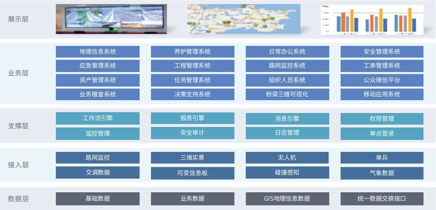 智慧安全公路管理服務(wù)系統(tǒng)以“統(tǒng)一組織、統(tǒng)一設(shè)計(jì)、跨部門協(xié)同”為指導(dǎo)思想,以路政管理、養(yǎng)護(hù)管理、應(yīng)急指揮管理、費(fèi)用征收和統(tǒng)一的行業(yè)標(biāo)準(zhǔn)規(guī)范體系為基礎(chǔ),集成相關(guān)應(yīng)用工具和軟硬件系統(tǒng),讓管理更加準(zhǔn)確、高效、規(guī)范、可控,實(shí)現(xiàn)人、財(cái)、物一體化精確管理。