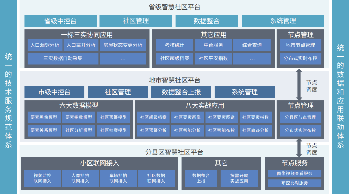 智慧社區(qū)平臺充分利用大數(shù)據(jù)、人工智能、物聯(lián)網(wǎng)等新技術,利用各類感知設備構建智慧小區(qū), 自動采集各類數(shù)據(jù),結合公安數(shù)據(jù)中心掌握的各類警情、案件數(shù)據(jù),構建大數(shù)據(jù)中心智慧社區(qū)專題庫,并進行智能分類處理、關聯(lián)、分析實現(xiàn)數(shù)據(jù)的統(tǒng)一智能管理, 建立預警模型及相關服務。