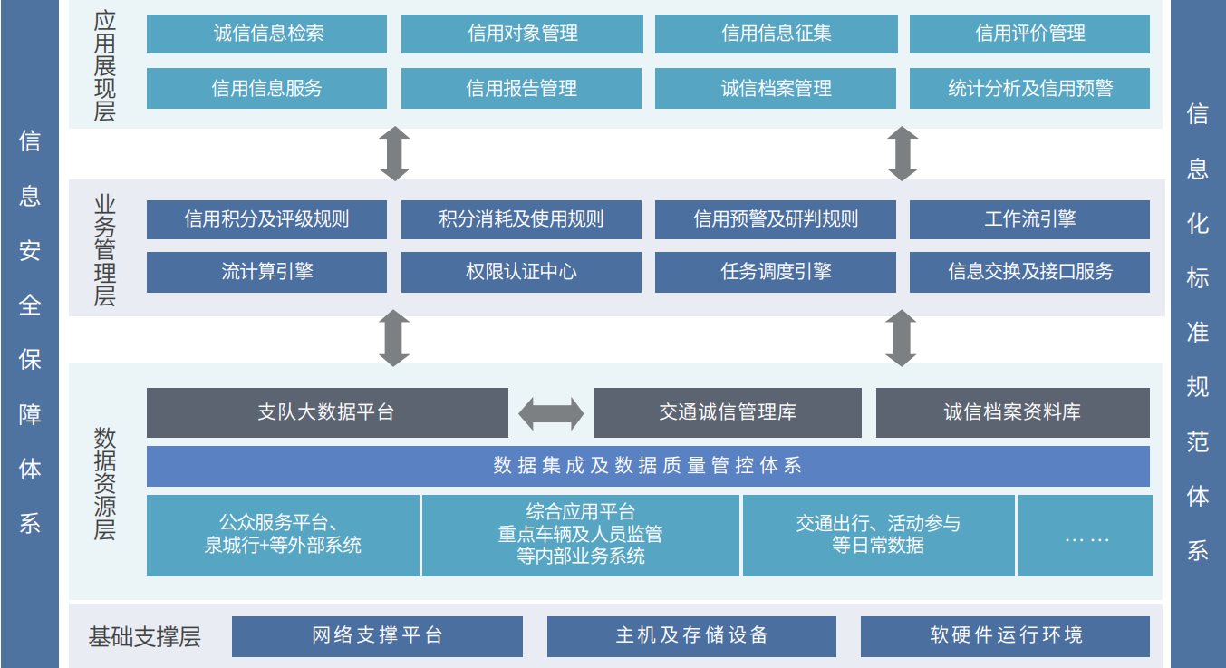 交通管理誠(chéng)信平臺(tái)以自然人、車輛、法人等征信基本對(duì)象為核心, 構(gòu)建360度誠(chéng)信對(duì)象模型。抽取各類相關(guān)信用信息到相應(yīng)對(duì)象模型,將交通違法信息及不文明交通行為等納入交通誠(chéng)信檔案,形成一種“誠(chéng)信受益、失信受戒”的交通安全管理機(jī)制??蔀橥獠啃庞帽O(jiān)管相關(guān)部門提供基礎(chǔ)數(shù)據(jù)支撐,為響應(yīng)全國(guó)社會(huì)信用體系建設(shè)提供保障。平臺(tái)主要包括交通誠(chéng)信畫像(誠(chéng)信信息檢索引擎)、信用對(duì)象管理、信用信息征集、信用評(píng)價(jià)管理、信用信息服務(wù)、信用報(bào)告管理、誠(chéng)信檔案管理、統(tǒng)計(jì)分析及交通誠(chéng)信預(yù)警、組織及用戶管理等。